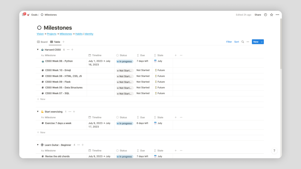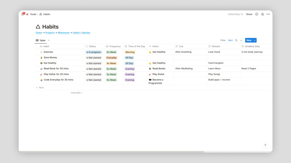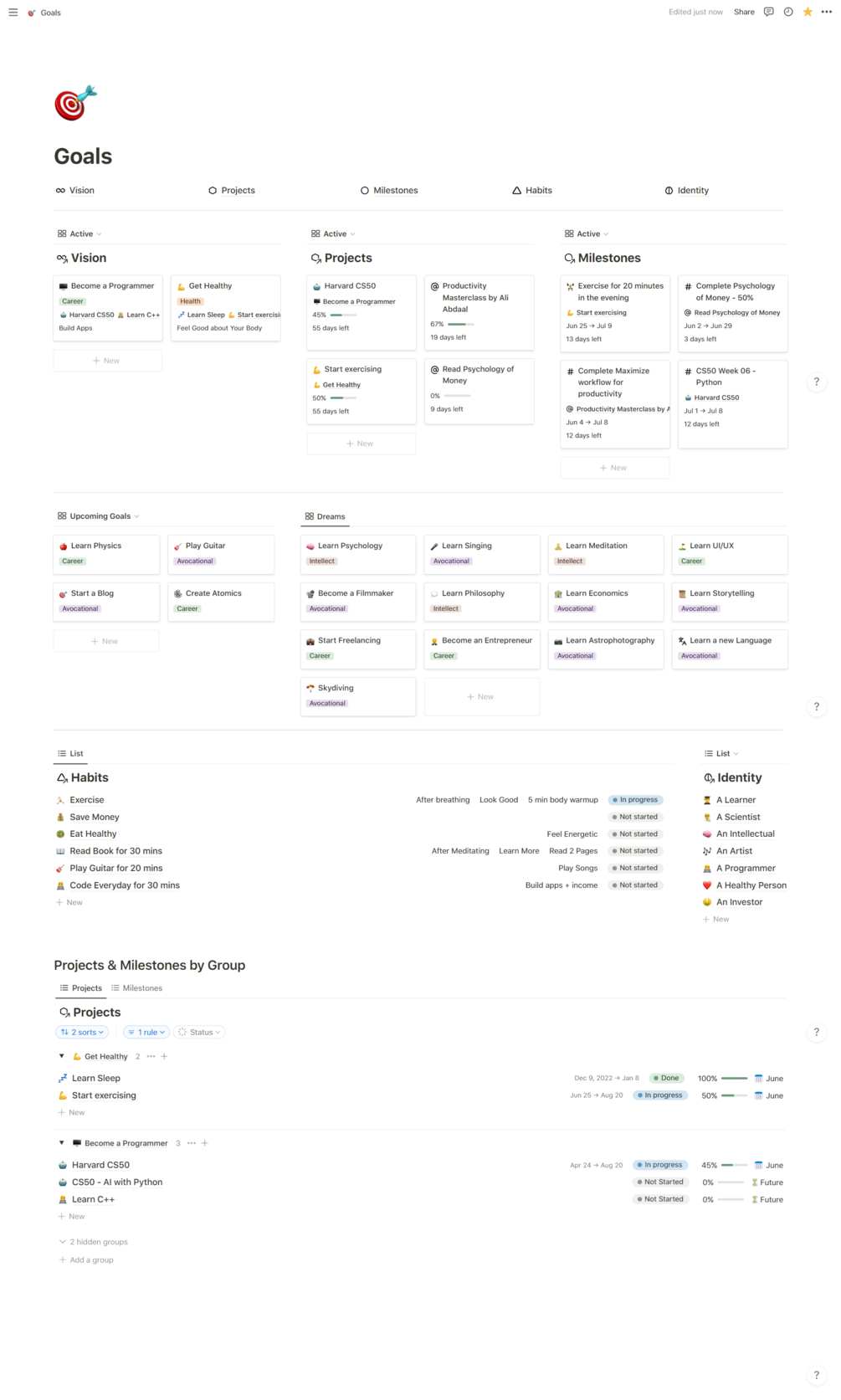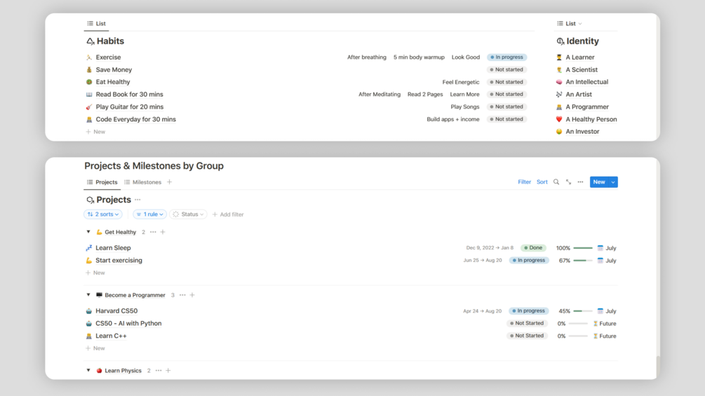 I recommend either using a to-do list app like Todoist to track day-to-day tasks which come under the broad category of milestones or creating a database for day-to-day tasks called "actions" and linking it with the Routine App. - Identity - Finally, what identities do you need to shape in order to shift your mindset in accordance with that goal? It's crucial to enjoy the journey and feel inclined towards doing it. And we need to shape identities in order to achieve that.