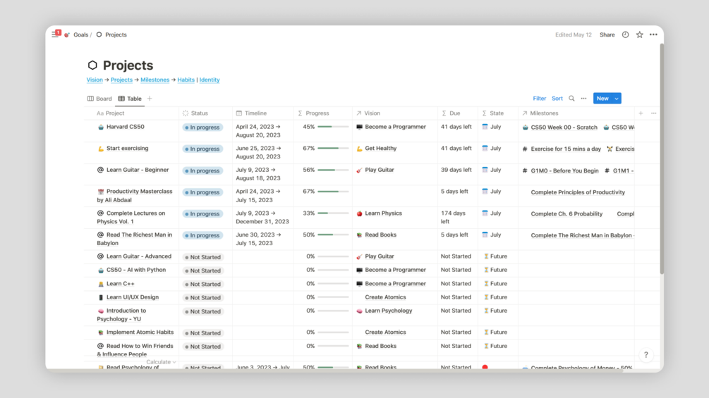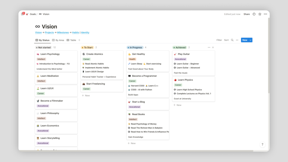 - Projects - Vision is broken down into projects which are usually months long. Breaking your goal into projects allows you to understand your goals at a more realistic scale and achieve them effectively